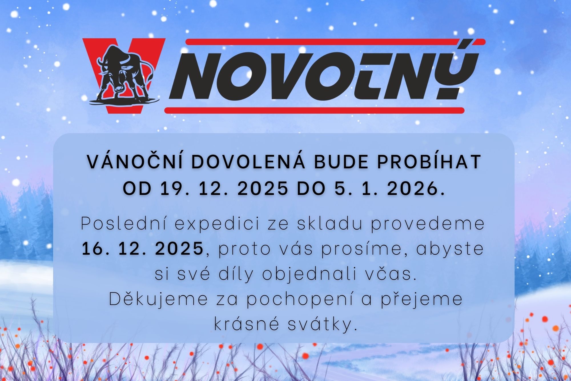 Poslední expedici ze skladu provedeme 16. 12. 2025, proto vás prosíme, abyste si své díly objednali včas.